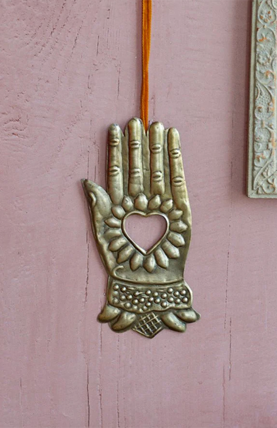 Handgjord guldfärgad hamsahand att hänga i julgranen eller dekorera med på andra sätt. Jättefin att hänga på ett skåp eller på en tavelvägg. Funkar lika fint året runt.