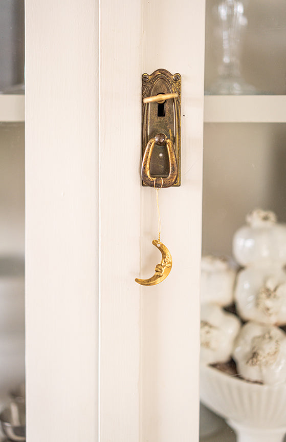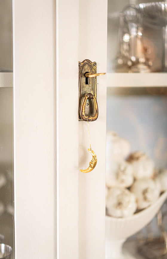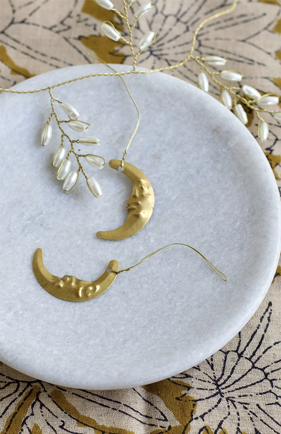 Handgjord måne i mässing att hänga i julgranen eller dekorera med på andra sätt. Funkar lika fint året runt. Jag kommer hänga den på ett gammalt skåp redan till novent.