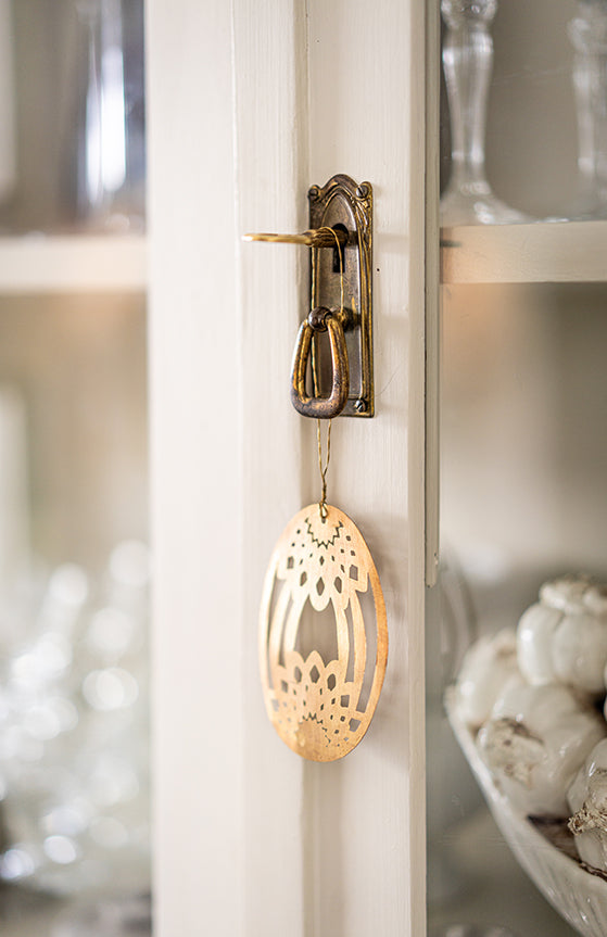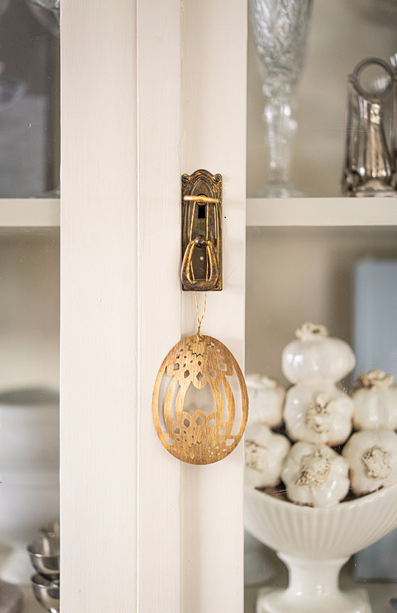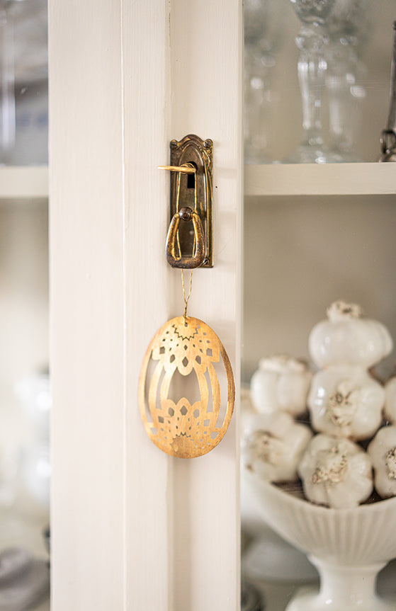Handgjort ägg i mässing att hänga i grenar, i påskriset eller dekorera med på andra sätt. Funkar lika fint året runt. Jag kommer hänga det på ett gammalt skåp redan till novent.